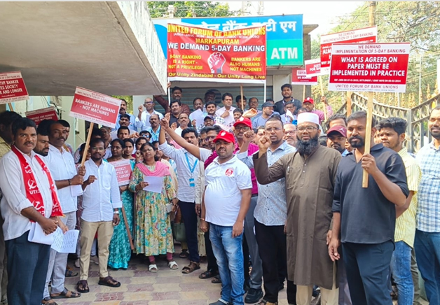 వారానికి ఐదు రోజుల పనిదినాలను అమలు చేయాలని కోరుతూ యునైటెడ్ ఫోరం ఆఫ్ బ్యాంకు యూనియన్స్ జాతీయ కమిటీ పిలుపు మేరకు మార్కాపురం జిల్లాలో అన్ని బ్యాంకుల ఉద్యోగులు పెద్ద ఎత్తున సమ్మెకు దిగారు. దీంతో ఎస్బీఐ, ఏపీజీబీ, కెనరా బ్యాంకు, యూనియన్ బ్యాంకు తదితర బ్రాంచిలన్నీ మూతపడ్డాయి. జిల్లాలో వందకు పైగా బ్యాంకుల కార్యకలాపాలు స్తంభించాయి. స్థానిక స్టేట్బ్యాంకు కార్యాలయం నుండి పెద్ద ఎత్తున ప్రదర్శనగా బయలుదేరి ఆర్టీసీ బస్టాండ్, కోర్టు సెంటర్, కంభం సెంటర్, పాత బస్టాండ్ మీదుగా ప్రదర్శన చేపట్టారు. ఈ సందర్భంగా ఏఐటీయూసీ రాష్ట్ర అధ్యక్షులు రావులపల్లి రవీంద్రనాథ్ మాట్లాడుతూ న్యాయసమ్మతమైన డిమాండ్లు పరిష్కరించాలని బ్యాంకు ఉద్యోగులు అనేక సంవత్సరాలుగా ఆందోళన కార్యక్రమాలు చేపడుతున్నప్పటికీ ప్రభుత్వం స్పదించకపోవడం దారుణమని విమర్శించారు. 2022 వేతన సవరణ ఒప్పందం ప్రకారం ప్రభుత్వానికి బ్యాంకు శాఖల యూనియన్లకు ఒప్పందం జరిగిందని, ఆ సందర్భంగా 180 రోజుల్లో ఐదు రోజుల పనిదినాలు అమలుపరుస్తామని చెప్పారని, కానీ నేటికీ అది అమలుకు నోచుకోలేదని విమర్శించారు. ప్రస్తుత పరిస్థితుల్లో కార్మిక హక్కుల కోసం పోరాటాలు కొనసాగిస్తూనే, మరోవైపు ప్రభుత్వం ఇచ్చిన వాగ్దానాల అమలుకు పెద్ద ఎత్తున పోరాటాలు చేయాల్సిన దుస్థితి ఏర్పడిందన్నారు. ఇప్పటికైనా కేంద్ర ప్రభుత్వం స్పందించి 2022లో జరిగిన వేతన సవరణ ఒప్పందాన్ని అమలు చేయాలని, లేనిపక్షంలో ఉద్యోగుల ఆగ్రహాన్ని చవిచూడాల్సి వస్తుందని రవీంద్రనాథ్ హెచ్చరించారు. యూఎఫ్బీయూ నాయకులు కె.కాశిరెడ్డి, బాలునాయక్, రామారావు, రమణారెడ్డి, బి.రాజానాయక్, కష్ణారెడ్డి తదితరులు పాల్గొన్నారు.