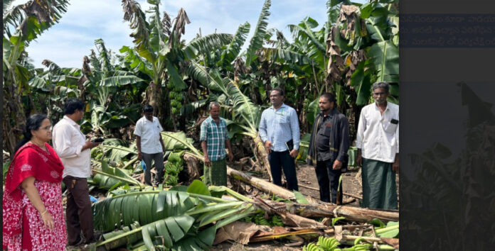 *ఉద్యానవన పంటల రైతులు సూచనలు పాటించండి* తుపాను ప్రభావం తో కురిసిన అధిక వర్షాలు మరియు గాలులు కు తాళ్లపూడి మండలం లోని పలు ప్రాంతాల్లో అరటి ఉద్యానవన పంటలు కూడా పాడయ్యాయి. మొంథా తుపాను నేపథ్యం లో రైతులు తగు జాగ్రత్తలు తీసుకోవాలని కొవ్వూరు మండలం ఉద్యాన అధికారి- డి.సుధీర్ కుమార్ తెలిపారు. అరటి ఉద్యాన పరిశోధన కేంద్రం శాస్త్రవేత్తలు బృందం, డాక్టర్ పి లలిత కామేశ్వరి, డాక్టర్ కే.రవీంద్ర కుమార్ బృందం కొవ్వూరు మండలం పెనకనమెట్ట, తాళ్లపూడి మండలం మలకపల్లి లో పర్యవేక్షించి రైతులకు మెళకువలు తెలిపారు .