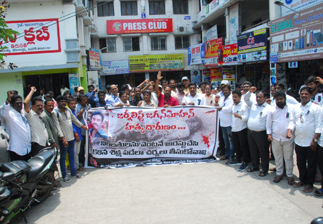 విశాలాంధ్ర-తిరుపతి:రాష్ట్రం లో జర్నలిస్టుల కు రక్షణ కరువైందని చెప్పడానికి చిత్తూరు జిల్లా వి కోట ఆంధ్రజ్యోతి విలేకరి జగన్మోహన్ దారుణ హత్య నిదర్శనమని ఇండియన్ జర్నలిస్ట్ యూనియన్ జాతీయ కార్యదర్శి కూన అజయ్ బాబు అన్నారు.మంగళవారం తిరుపతి నగరంలో నల్లబ్యాడ్జీలు ధరించి నిరసన చేపట్టారు. ఈ సందర్భంగా ఆయన మాట్లాడుతూ..జర్నలిస్టుల ప్రత్యేక రక్షణ కోసం కేంద్ర,రాష్ట్ర ప్రభుత్వాలు తక్షణ చర్యలు తీసుకోవాలని డిమాండ్ చేశారు. నిందితులను తక్షణం అరెస్టు చేసి కాగిన చర్యలు తీసుకోవాలని డిమాండ్ చేశారు.