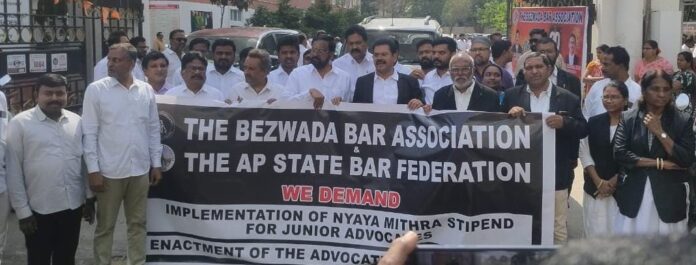 విశాలాంధ్రవిజయవాడ: జూనియర్ న్యాయవాదులకు ఇవ్వవలసిన న్యాయమిత్ర స్టైఫండ్ రూ 10వేలు తక్షణమే విడుదల చేయాలని, ఏపీ న్యాయవాదుల రక్షణ చట్టాన్ని వెంటనే అమల్లోకి తీసుకురావాలని రాష్ట్రవ్యాప్తంగా అన్ని బార్ అసోసియేషన్లు శుక్రవారం కోర్టు విధులను బహిష్కరిస్తూ పెద్దఎత్తున నిరసన చేపట్టారు.
