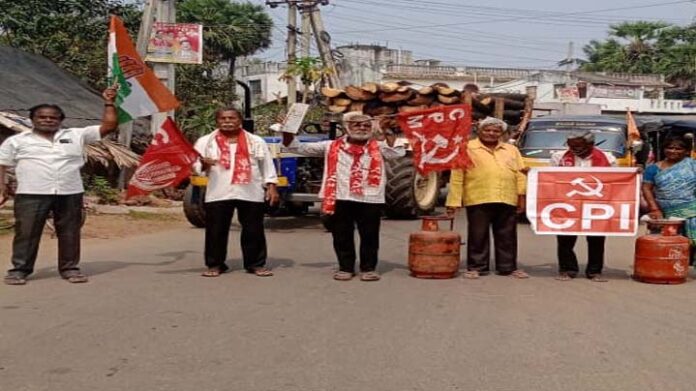 విశాలాంధ్ర, నెల్లిమర్ల /కంటోన్మెంట్ :నెల్లిమర్ల విద్యుత్ స్టోర్స్ వద్ద మంగళవారం వామపక్షాల ఆధ్వర్యంలో భారీ నిరసన ప్రదర్శన జరిగింది. పెంచిన గ్యాస్ ధరలను వెంటనే తగ్గించాలని డిమాండ్ చేస్తూ సీపీఐ, సీపీఎం నేతలు ముయ్యద పాపారావు, కిల్లంపల్లి రామారావు ఆధ్వర్యంలో ధర్నా నిర్వహించారు. కేంద్రంలోని మోడీ ప్రభుత్వం యుద్ధాన్ని సాకుగా చూపి కమర్షియల్ సిలిండర్పై ₹150, గృహ అవసరాల సిలిండర్పై ₹60 పెంచి సామాన్యుల నడ్డి విరిచిందని వారు మండిపడ్డారు. రాష్ట్రంలో ప్రజా సమస్యలను గాలికి వదిలేసి లడ్డు చుట్టూ రాజకీయాలు చేయడం దుర్మార్గమని విమర్శించారు. యుద్ధం కారణంగా అంతర్జాతీయ మార్కెట్లో ఆయిల్ ధరలు పెరిగి సామాన్య ప్రజలు తీవ్ర ఇబ్బందులు పడతారని అన్నారు.ఈ కార్యక్రమంలో తాలాడ రామకృష్ణ, కనకల పద్మనాభం తదితరులు పాల్గొన్నారు.