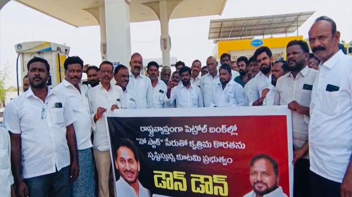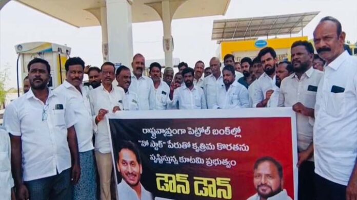 బంక్ వద్ద వైస్సార్సీపీ నిరసన – ప్రభుత్వం డౌన్ డౌన్ నినాదాలు..
